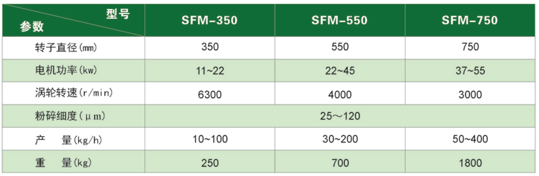 該機由機體、機架、進料斗、粉碎裝置、出料管、傳動裝置和電機等組成,物料從進料管進入由靜盤和動磨盤組成的粉腔內,由于動盤的速度旋轉和風機的作用下,使物料不斷被剪切、撞擊、摩擦、顆粒越來越小,并向外移動,最后經過出料管由集料系統收集。