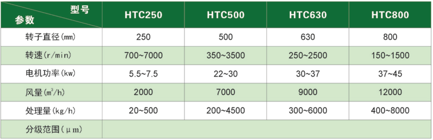 物料進(jìn)入分級(jí)室后,在渦殼與分級(jí)渦輪高速旋轉(zhuǎn)下產(chǎn)生離心力場,符合粒度要求微粉通過渦輪被收集,粗料則落入下箱體,通過關(guān)風(fēng)機(jī)被收集。由于渦輪與上箱體采用特殊的密封機(jī)構(gòu),使得密封效果十分優(yōu)越,出料粒度更均勻。通過調(diào)節(jié)驅(qū)動(dòng)電機(jī)的轉(zhuǎn)速及二次進(jìn)風(fēng)量的大小,可得到最佳的分級(jí)效果。
