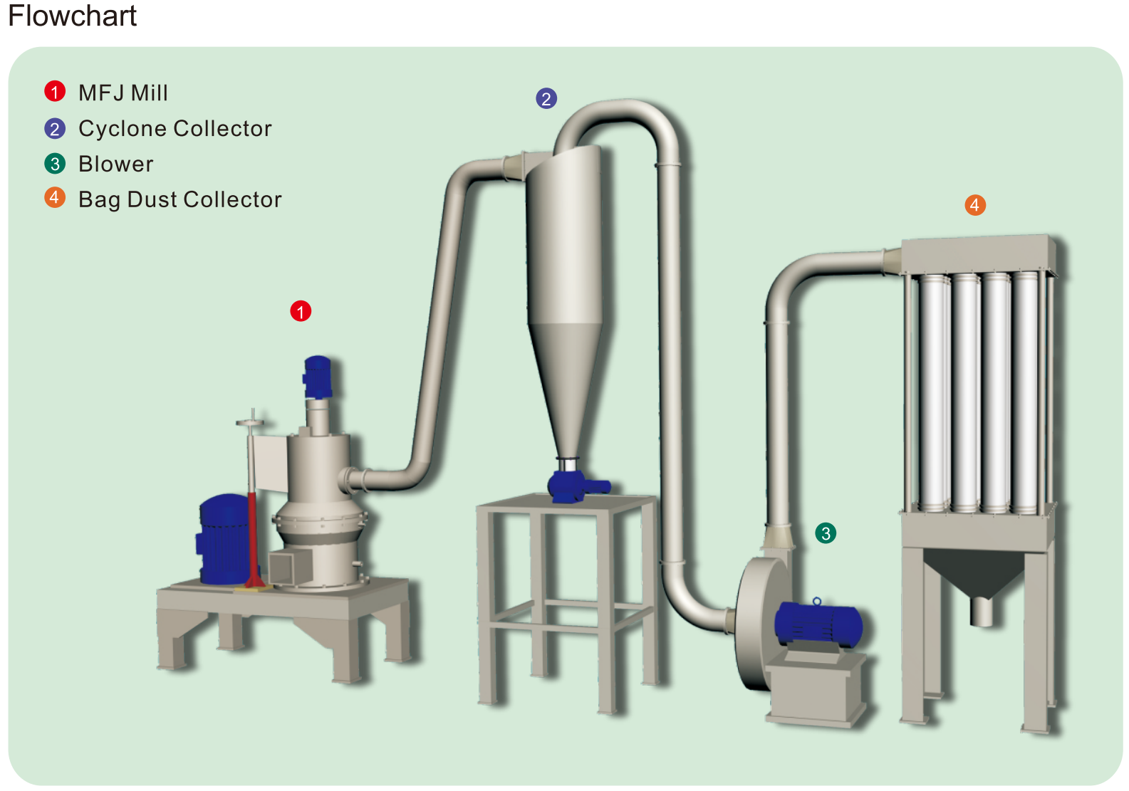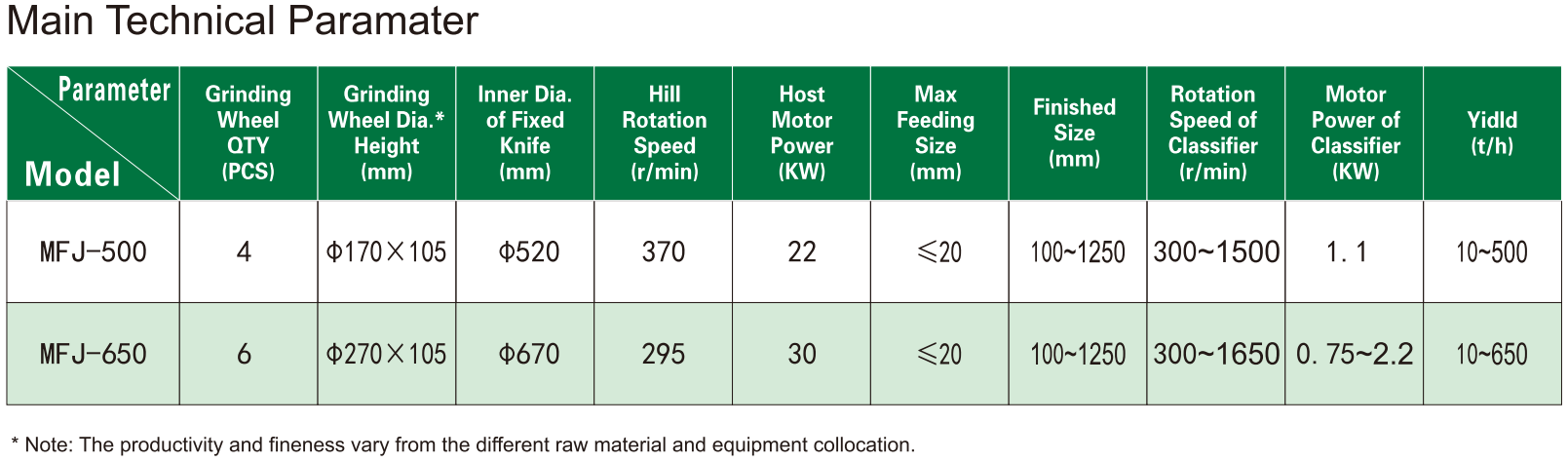 The MFJ machine drives the spindle through the transmission device.There are 4 - 6 pieces of auxiliary shaft on the rotor shelf, and the shelf head is connected with the spindle. The grinding wheel and swing arm device, which are on the auxiliary shaft consist of the swinging pivot. The grinding wheel generate the strong centrifugal force because of it's revolution and rotation, and enter into the comminution area which consist of grinding wheel and the fixed knife, and be pulverized by the strong extrusion and grinding effect. There is scraper system under the rotor shelf, which is under the grinding wheel device. The scraper take the meterial into in comminution while rotate with the grinding wheel simultaneously. Then comes the Bedding layer. This layer is crushed by the rotation of the grinding wheel and the internal and external centrifugal force (i.e., extrusion pressure), then the powder is grinded.