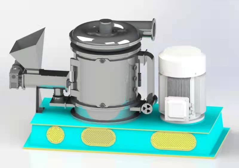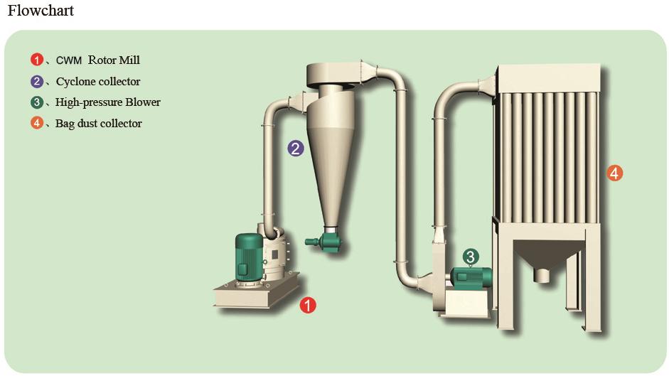 The grinding rotor is composed of several horizontal disks and vertical blades, these consist many stagger arranged crushing chambers. The air in the small chamber is elastic. Due to the impact of the air flow, the grinding chamber on the rotor tinily vibrate. The indoor sound wave of audible sound of 140 dB, and in some regions produce the atmospheric pressure difference of 0.025, which help the sonic jet-flow and vortex appear, and promote the mutual friction and impact between materials into powder. The special-designed rotor of this model equipped with 2 blowers. The lower blower produce jet stream to suck and speed up the material. The upper blower is the main blower and deliver the material outside. There are many la