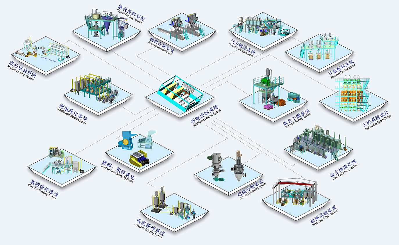 公司自1998年從事鋰電石墨微粉球化粉碎深加工成套設備的開發應用,集成國內外先進粉體加工技術,引進吸收消化再創新,集成各類技術,進行創新。開發了新-代的鯉電池石墨新材料微粉球形化成套設備。該生產線有上料系統、粗粉碎系統、微粉球形化粉碎系統、尾料收集系統、成品輸送系統和自動化系統等組成,形成年產1000~3000噸成套生產線。能將天然石墨、人造石墨和其他易石墨化的碳材料粉碎至粒度在5~ 30um范圍,產品球化得率高,振實密度好,產量高。該成套設備已有數十條生產線,廣泛應用于國內外鋰電石墨新材料行業。