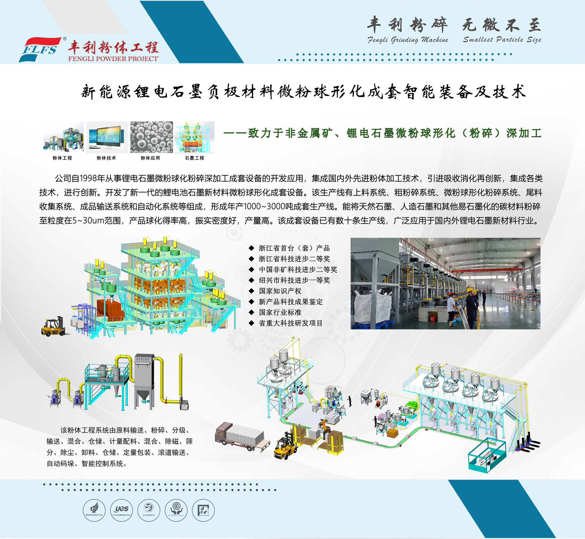 公司自1998年從事鋰電石墨微粉球化粉碎深加工成套設備的開發應用,集成國內外先進粉體加工技術,引進吸收消化再創新,集成各類技術,進行創新。開發了新-代的鯉電池石墨新材料微粉球形化成套設備。該生產線有上料系統、粗粉碎系統、微粉球形化粉碎系統、尾料收集系統、成品輸送系統和自動化系統等組成,形成年產1000~3000噸成套生產線。能將天然石墨、人造石墨和其他易石墨化的碳材料粉碎至粒度在5~ 30um范圍,產品球化得率高,振實密度好,產量高。該成套設備已有數十條生產線,廣泛應用于國內外鋰電石墨新材料行業。